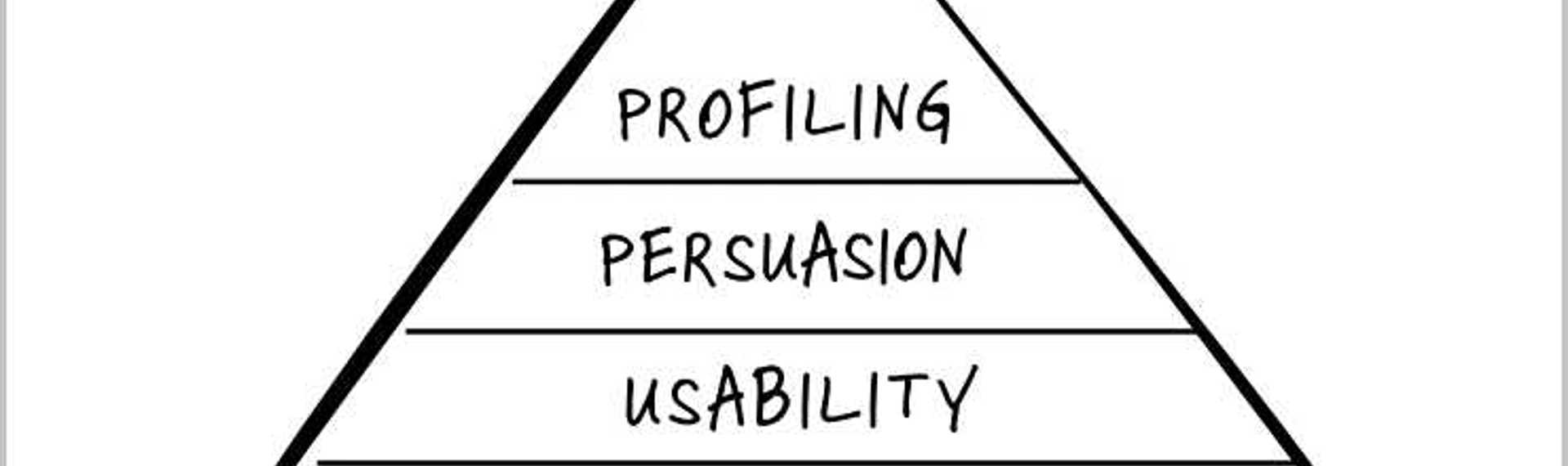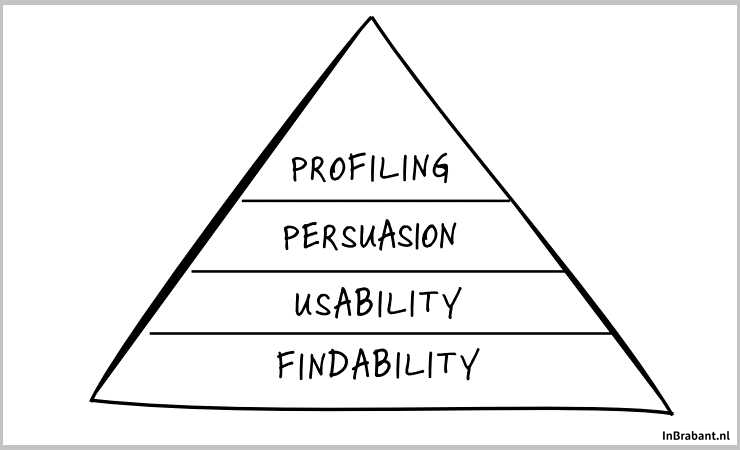 Het begint allemaal met de ‘conversiepiramide’. Met conversie bedoelen we omzetting, ofwel het omzetten van een bezoek in een actie (zoals een aanmelding, download, contactaanvraag, inschrijving, boeking, bestelling of betaling). De basis van de piramide is ‘findability’. Vindbaar zijn in Google is jouw lifeline. Dus: Wat is je businessdoel en welke segmenten (doelgroepen) gaan je helpen je doel te behalen? Breng per segment in kaart hoe zij zoeken: Waar zijn ze naar op zoek? Welke woorden gebruiken ze? ‘Usability’ betekent dat een bezoeker zonder nadenken zijn taak moet kunnen uitvoeren, of zoals informatiearchitect Steve Krug schreef in zijn gelijknamige usability-bijbel: ‘Don’t make me think’.