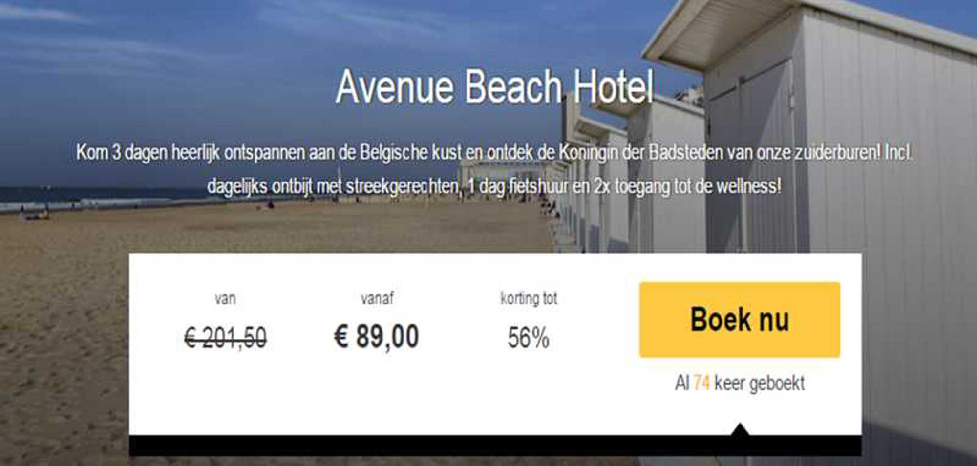 Op de website waar je Avenue Beach Hotel kunt boeken, heeft de visual designer een subtiel pijltje geplaatst bij ‘Al 74 keer geboekt!’ en de button 'Boek nu’ een contrasterende kleur gegeven – zodat ieders oog automatisch daarop valt.