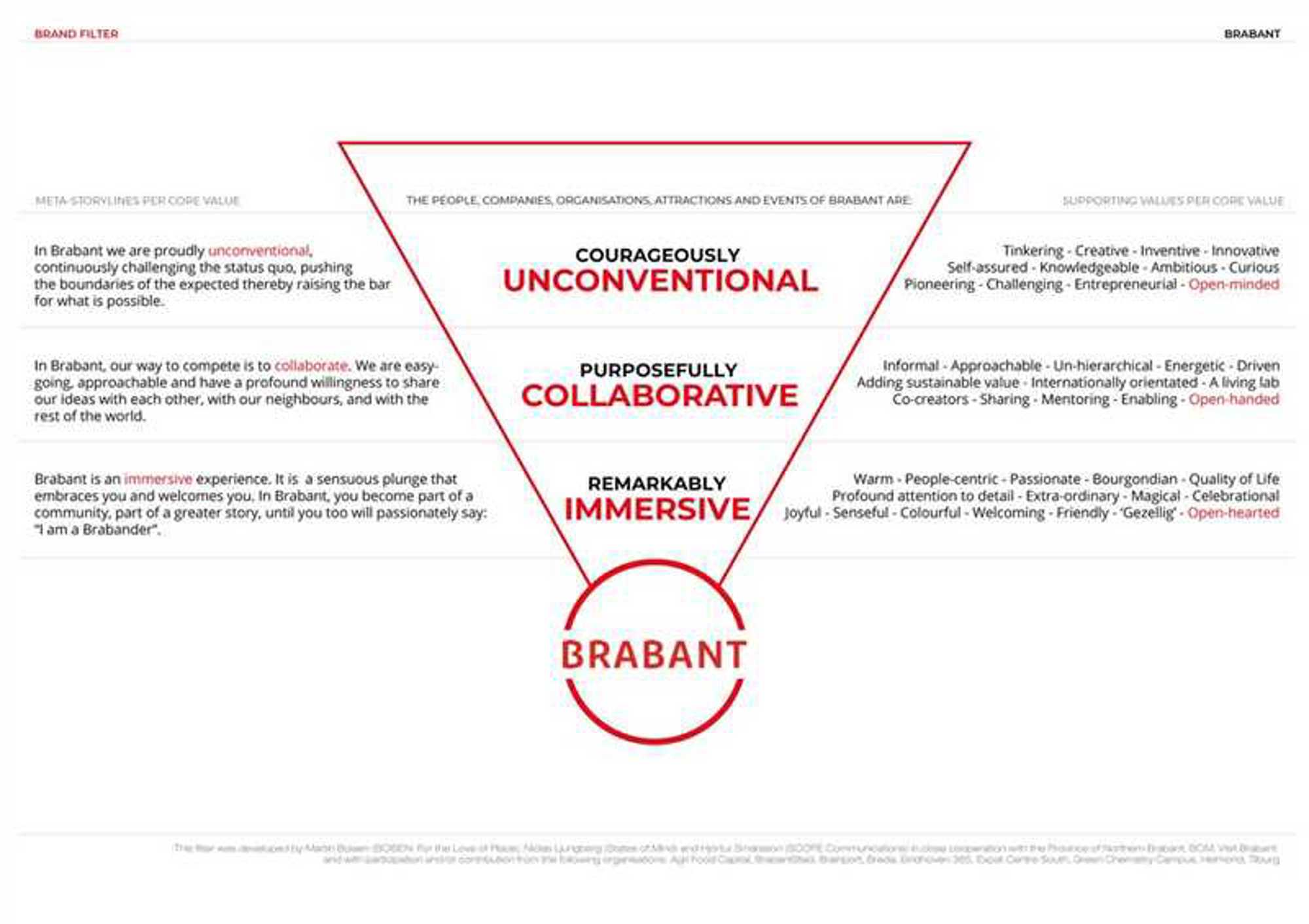 Brabant hanteerde jaren geleden de waarden high tech/ high touch. Succesvol in ondernemerschap, kennis en innovatie (high tech), maar ook Bourgondisch, gastvrij en gemoedelijk (high touch). Die waarden zijn een aantal jaar geleden (2017) onder de loep genomen en beoordeeld als passend, maar te algemeen. Met de samenwerkingspartners zijn de waarden daarom aangescherpt. Er is gekozen voor de volgende drie merkwaarden die Brabant uniek maken. Het zijn de dragers van de Brabantse identiteit.